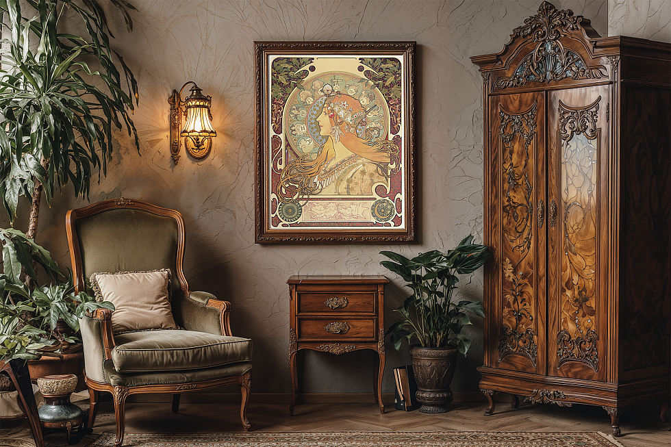 Невероятно красивые оригинальные работы Альфонса Мухи, переработанные нами в нейросетях с улучшенным для печати качеством могут стать яркими панно или декоративными элементами в мебели, зеркальных и стеклянных объектах.